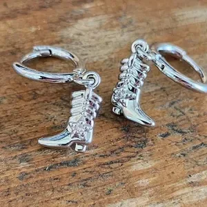 Boucles d’oreilles créoles en acier inoxydable avec un pendentif en forme de botte de cow-boy.